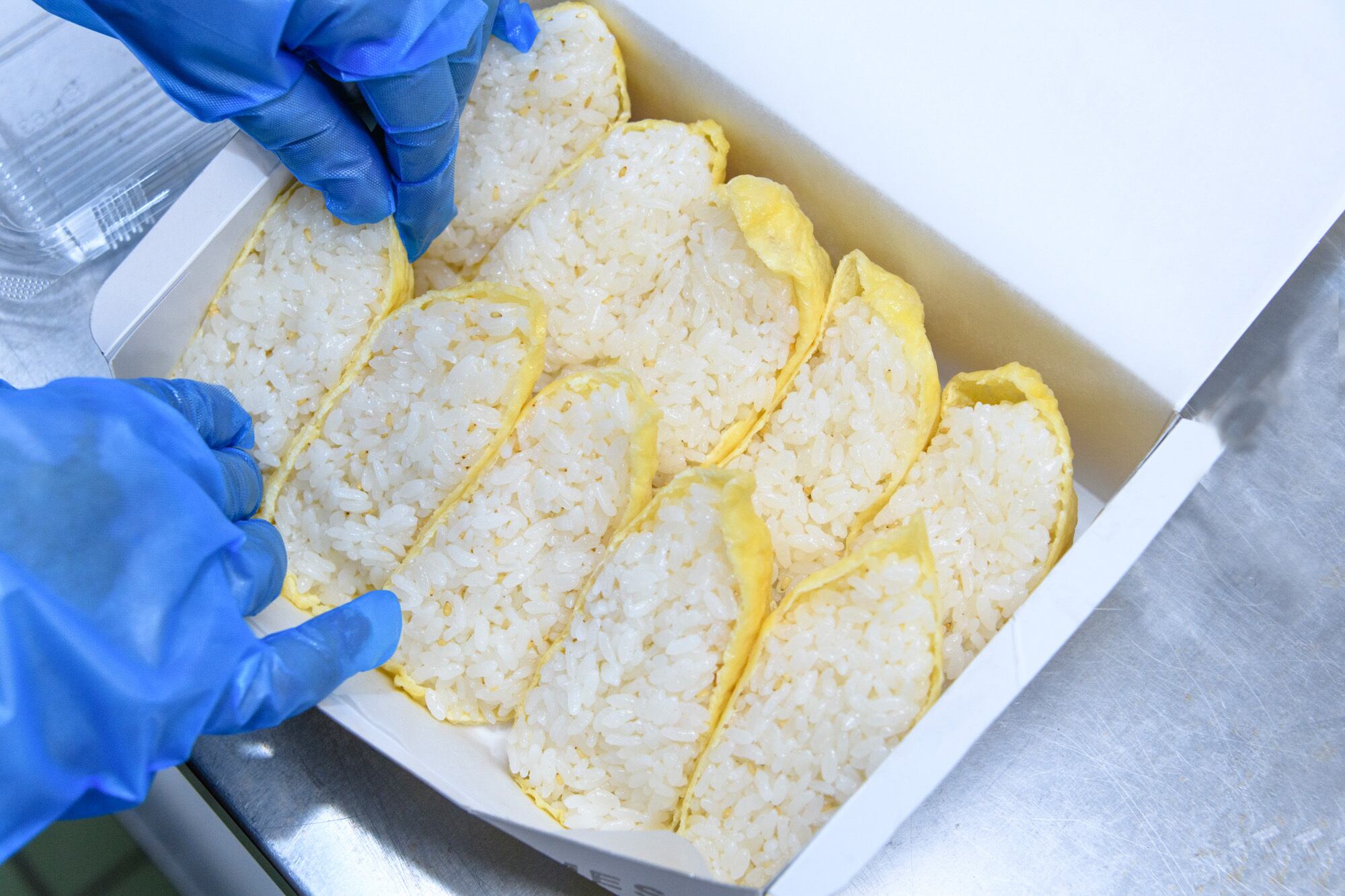 いなりは海道産のお米「ななつぼし」を軟水でふっくら炊きあげ、九州産の大豆「フクユタカ」で作る自家製の「お揚げ」でお包みしております。